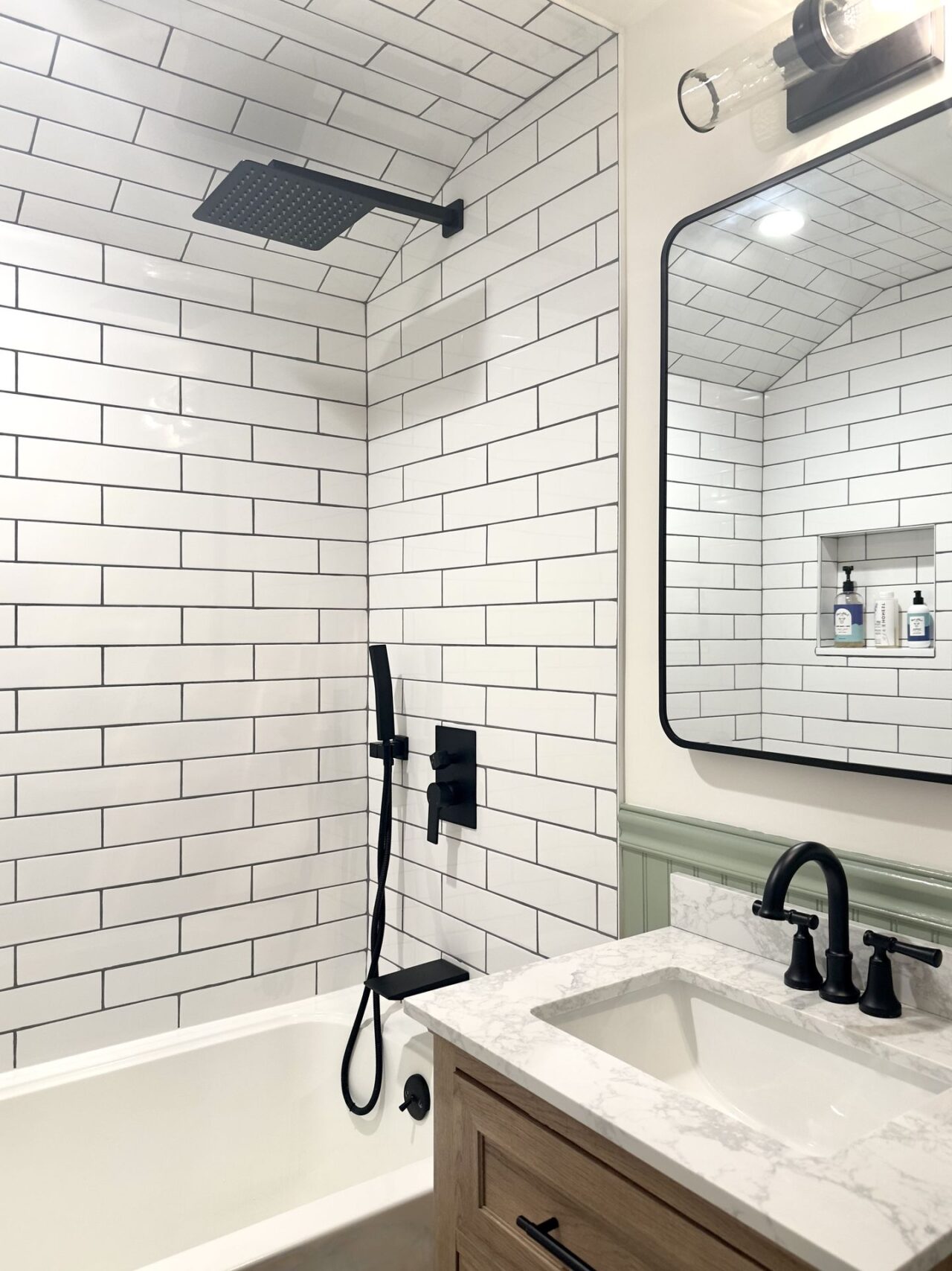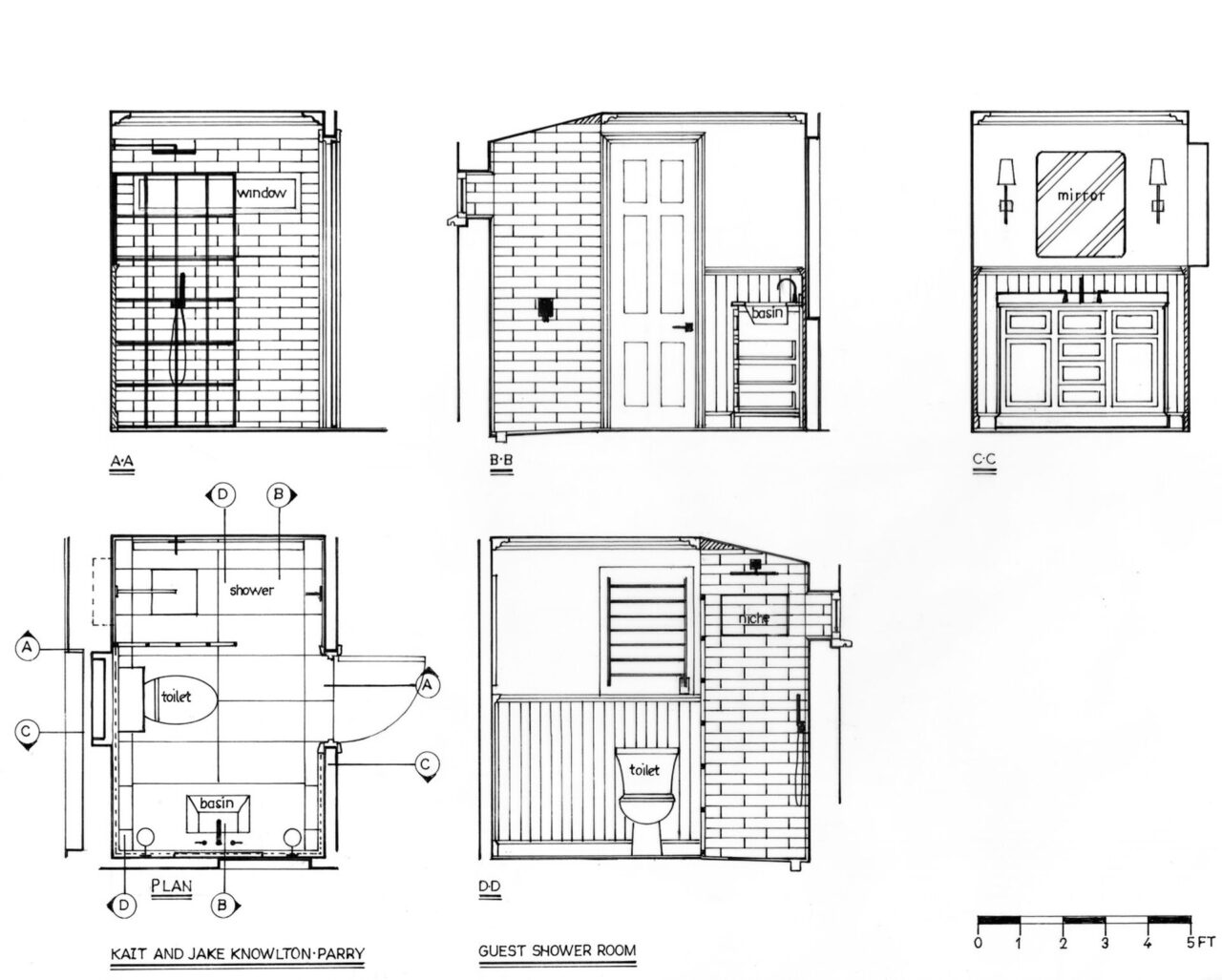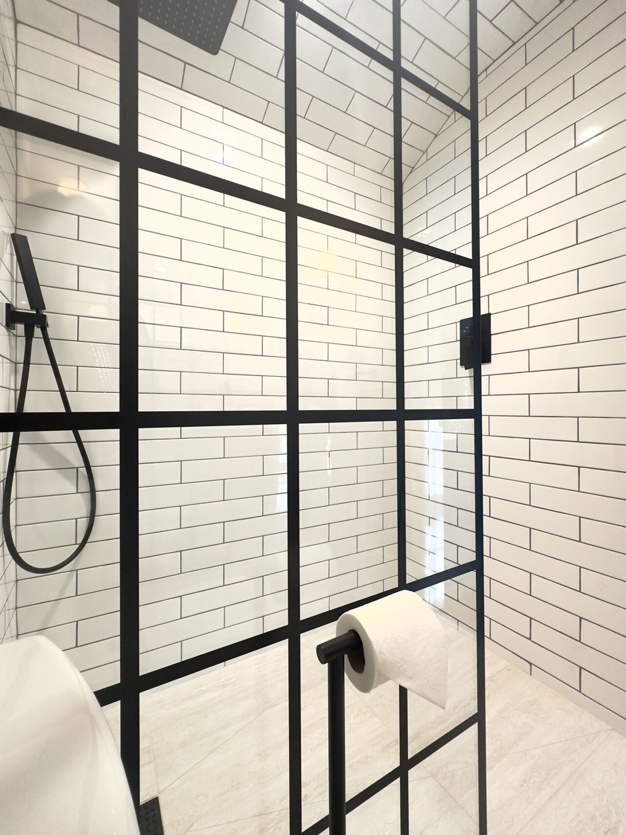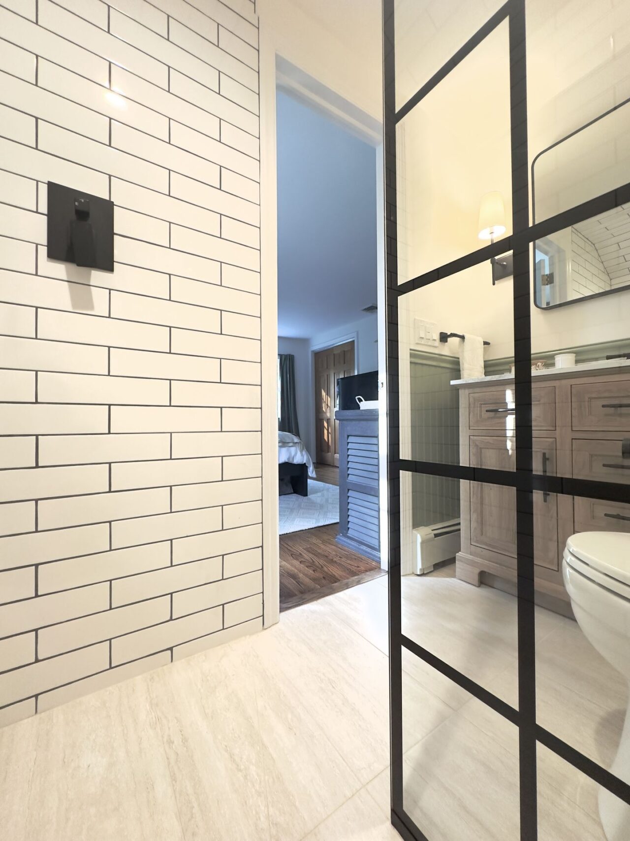 I worked on this job in Connecticut, USA remotely. My clients had bought a beautiful painted timber clad house which they loved in its entirety apart from 2 very tired bathrooms accessed from the first-floor landing. Both bathrooms were very narrow, but once I had drawn up the survey (following instructions from me on how to survey) I discovered that the wall between the 2 bathrooms to house the pipework was 40 centimetres (16 inches) thick and far wider than needed. Consequently, I was able to enlarge both bathrooms by enough to ensure that they were both more useable. The original shower room was next to the guest bedroom, so we shifted the doorway from the landing to inside the bedroom to provide its own ensuite shower room. This in turn created enough space to install a wonderfully wide vanity unit where the original doorway had been to include very much needed storage. Then in keeping with the style of the house my clients selected a mixture of painted panelling and clean white metro tiles for the walls which was contrasted with beautifully modern black brassware.
