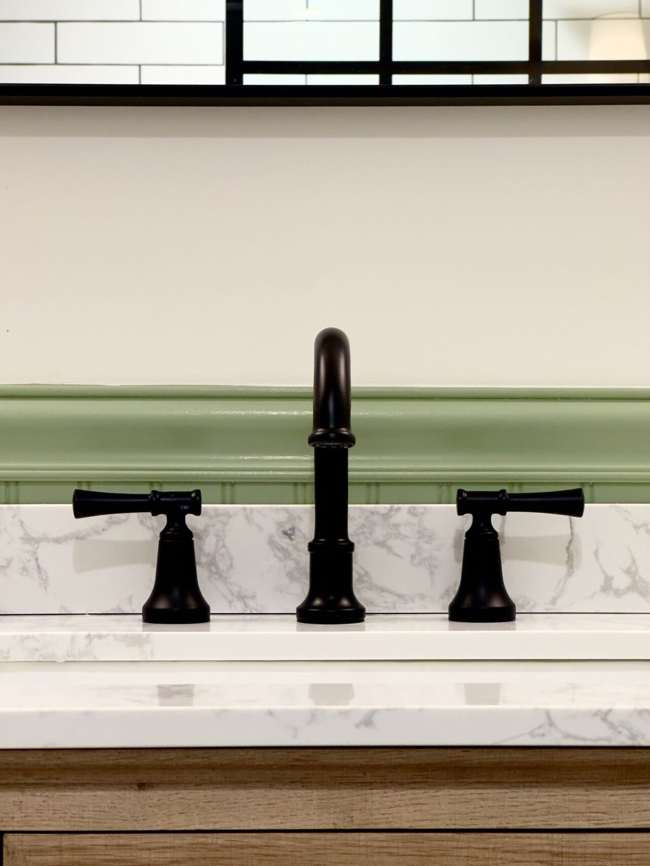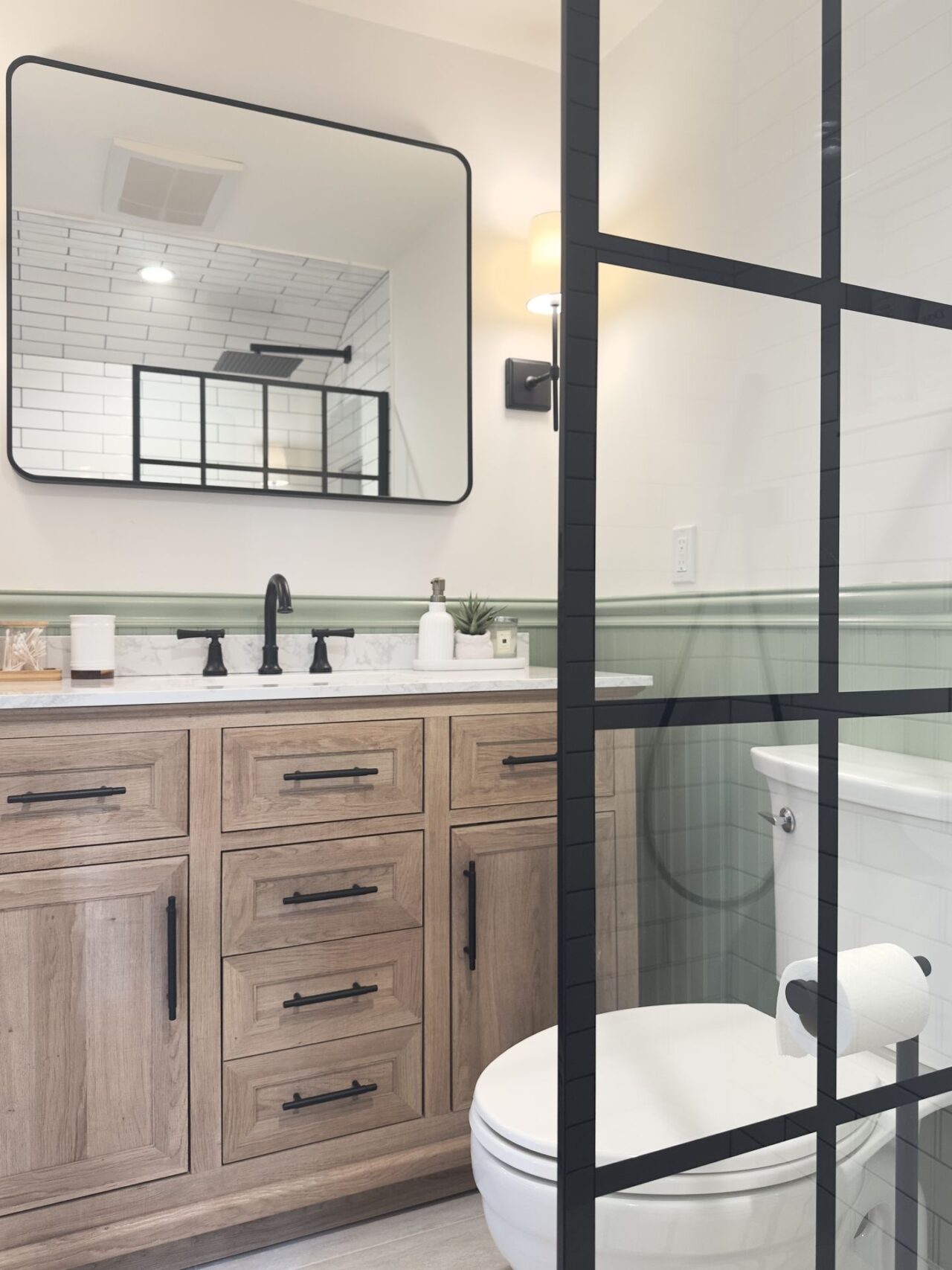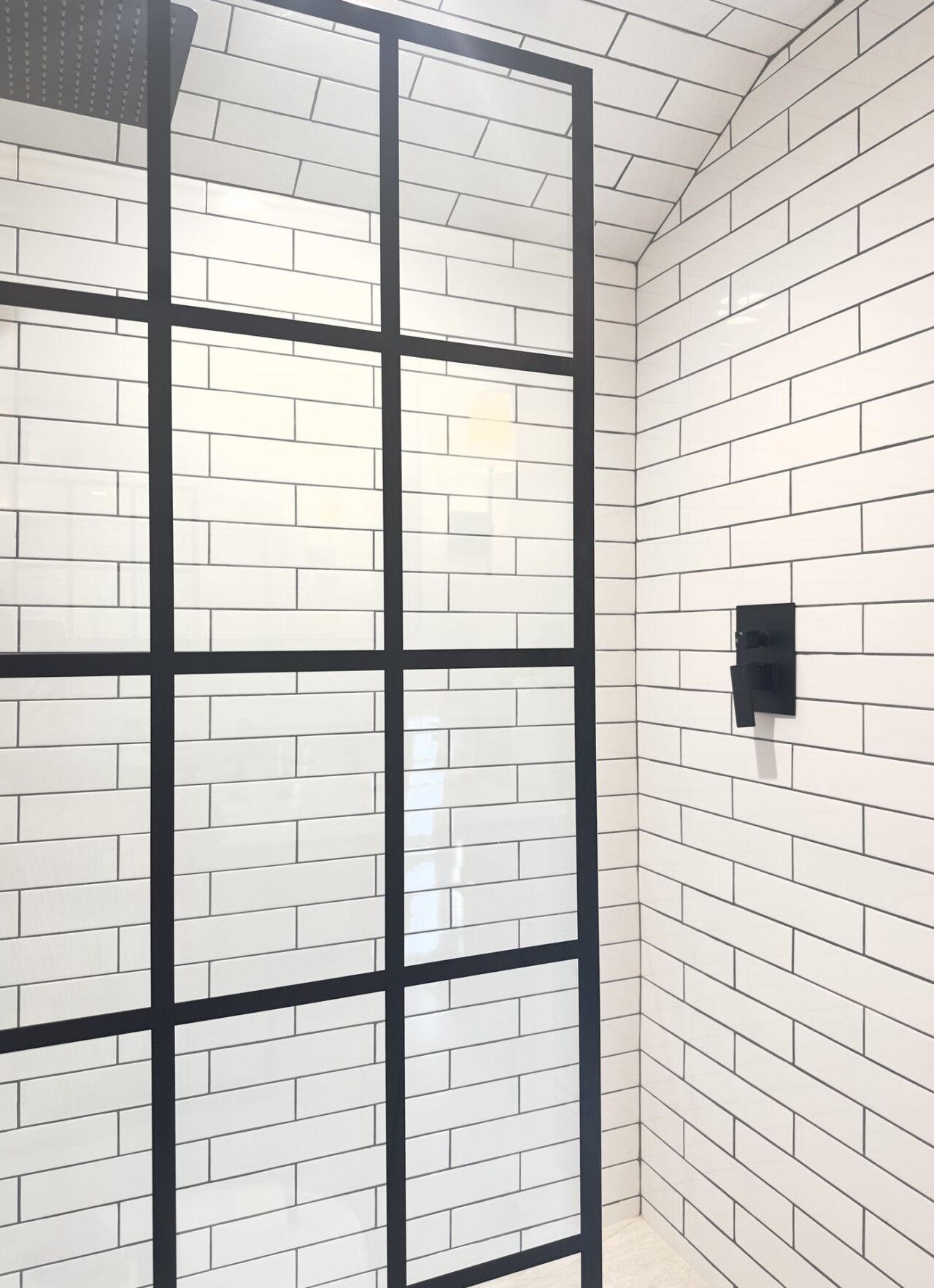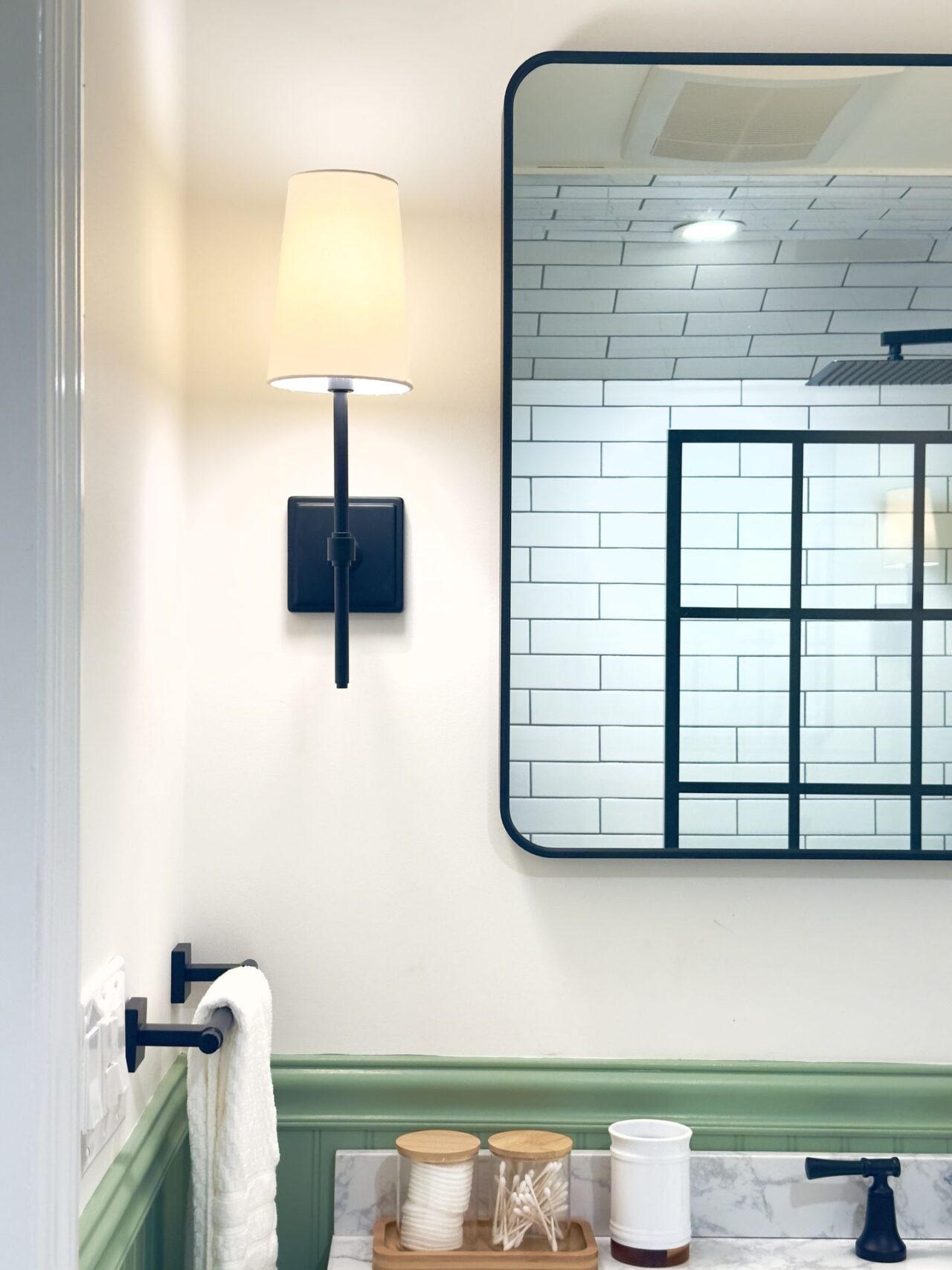 I worked on this job in Connecticut, USA remotely. My clients had bought a beautiful painted timber clad house which they loved in its entirety apart from 2 very tired bathrooms accessed from the first-floor landing. Both bathrooms were very narrow, but once I had drawn up the survey (following instructions from me on how to survey) I discovered that the wall between the 2 bathrooms to house the pipework was 40 centimetres (16 inches) thick and far wider than needed. Consequently, I was able to enlarge both bathrooms by enough to ensure that they were both more useable. The original shower room was next to the guest bedroom, so we shifted the doorway from the landing to inside the bedroom to provide its own ensuite shower room. This in turn created enough space to install a wonderfully wide vanity unit where the original doorway had been to include very much needed storage. Then in keeping with the style of the house my clients selected a mixture of painted panelling and clean white metro tiles for the walls which was contrasted with beautifully modern black brassware.